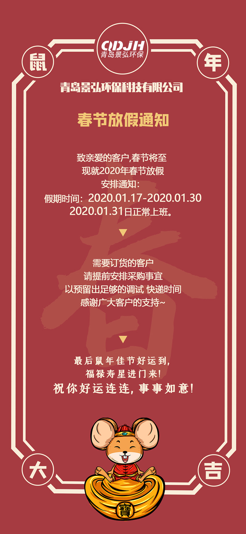 景弘環保2020年春節放假通知