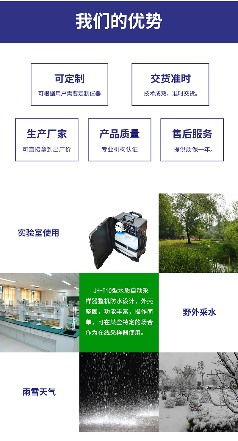 JH-T10水質自動采樣器整機防水設計,外殼堅固,功能豐富,操作簡單,可全天候應用,無需有復雜的專業知識,該產品非常方便用戶便攜應用,亦可在某些特定的場合作為在線采樣器使用,性價比高,滿足用戶的應用需求。