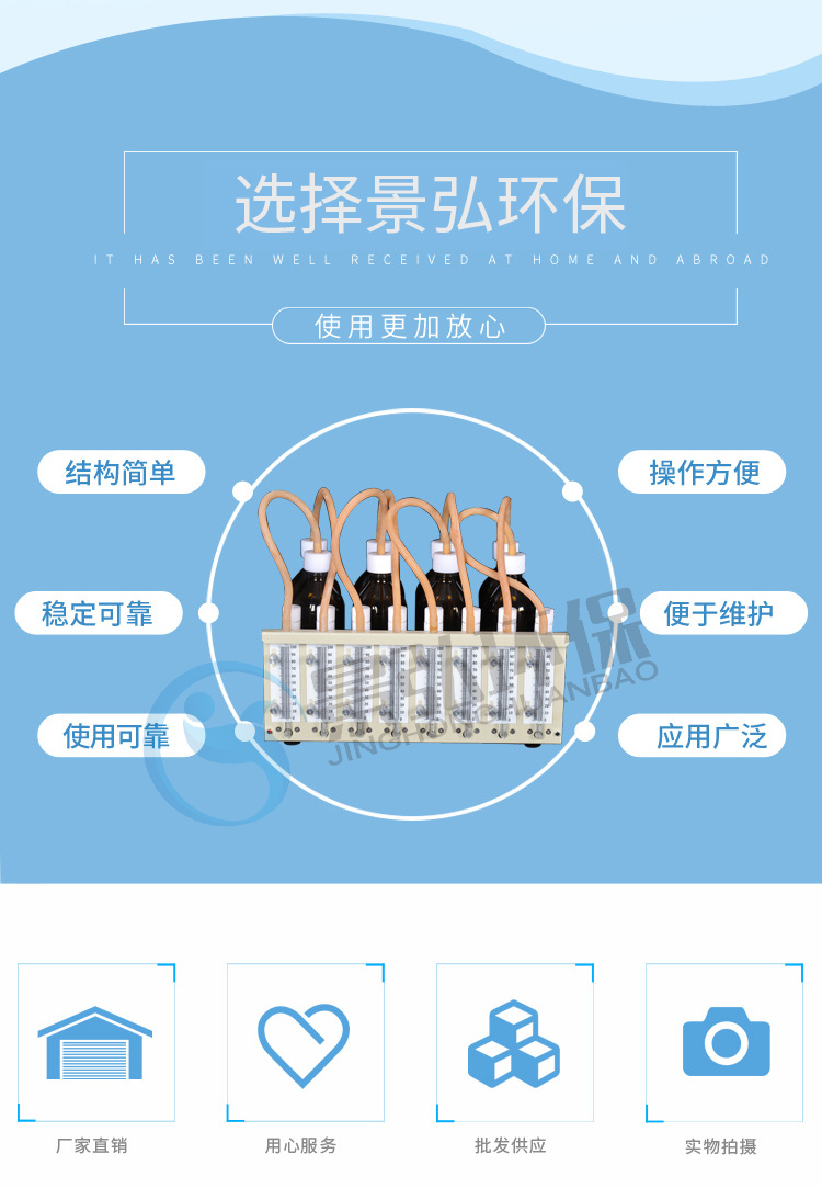 目前BOD測定方法,主要是用化學稀釋法,其方法繁鎖,工作量大,高倍數稀釋時往往會引起較大誤差。JH-CY型直讀BOD5測定裝置的測定原理是把水樣或經過預處理的水樣注入培養瓶內,同時放入二氧化碳吸收劑(NaOH),然后將培養瓶密封置于20±1℃的恒溫箱內,在一定攪拌速度下對培養瓶內試樣進行培養。由于好氣微生物的反應,將消耗水中的氧氣,呼出二氧化碳,如果我們及時地用NaOH吸收生成的二氧化碳,培養瓶內上部空間的氧氣不斷地供給試樣中微生物的需氧量,這就造成了氣體氧分壓的下降,用差壓計測出氧分壓的下降量就可以測出水樣的BOD值。