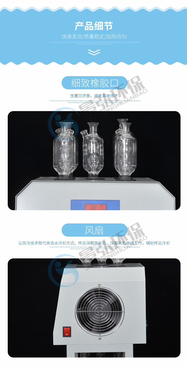 儀器采用微機技術進行定時控制加熱電爐,可對6個消解器瓶回流裝置同時進行加熱。從而達到節能增效的目的。 該儀器采用玻璃玻璃毛刺回流管代替球形回流管,并以風冷技術取代水冷,從而提高儀器的穩定性和安全性。