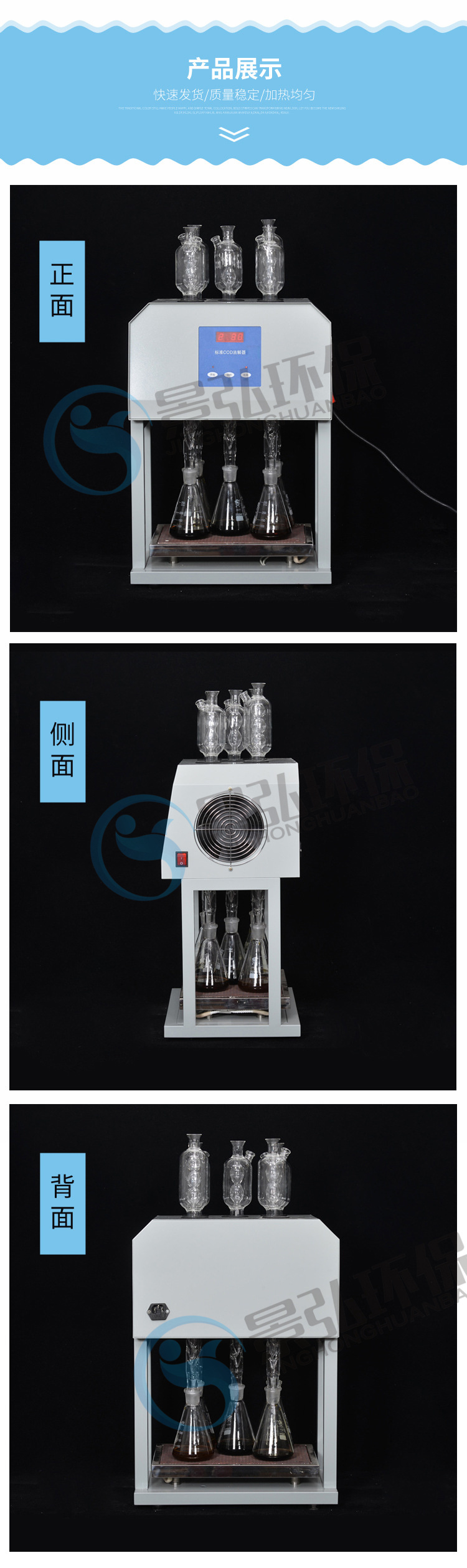 儀器的化學溶液配制、操作和COD的計算遵照GB11914-89,低于50mg/L的COD水樣可通過稀釋滴定劑和氧化劑來提高精確度,高于1000mg/L的COD水樣,可通過水樣的比例稀釋來完成測定。