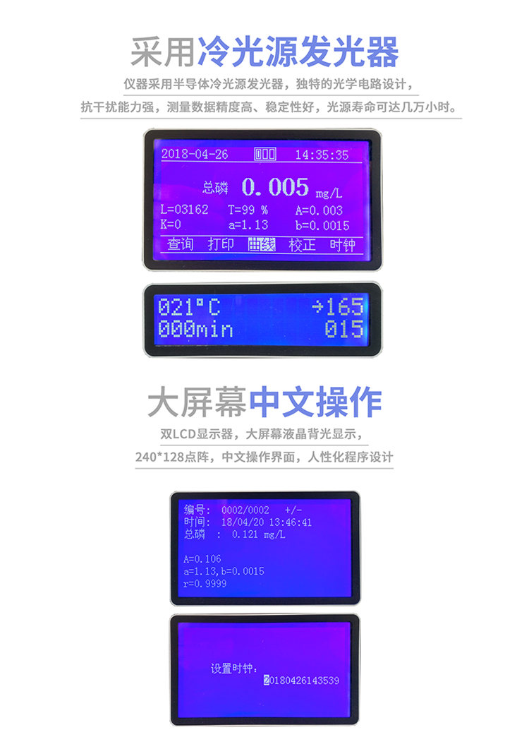JH-TP202型總磷快速測定儀符合GB11893-89 規定的鉬酸銨分光光度法,將經典的酸銨分光光度法與計算機技術結合起來,應用微電腦光電子比色檢測原理取代傳統的目視比色法,測量分辨率大大提高。該產品具有自動PID控溫、雙液晶顯示、交直流兩用、自動調零、濃度直讀、曲線存儲、自動打印等特點,儀器操作簡便,人機交互式操作,使用者無需復雜的專業知識即可應用本產品。可廣泛地應用于廠礦企業排污口監測、城市污水處理工廠進出口監測、江河湖泊水質監測和污水治理設施過程控制之中。