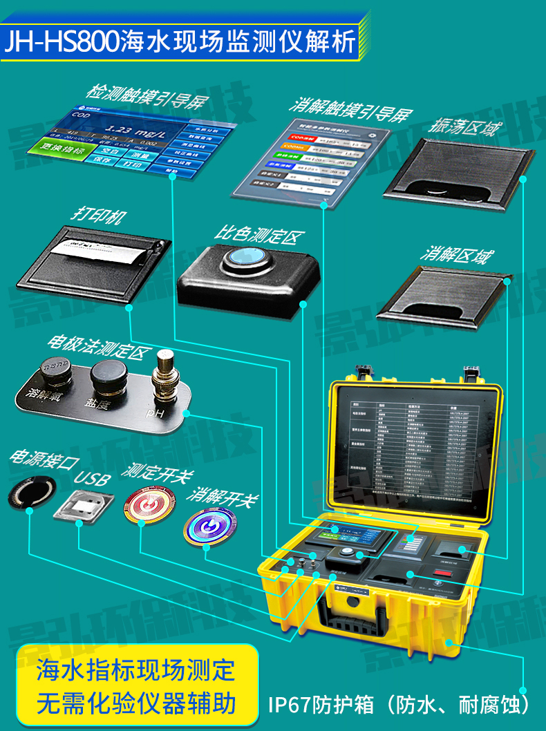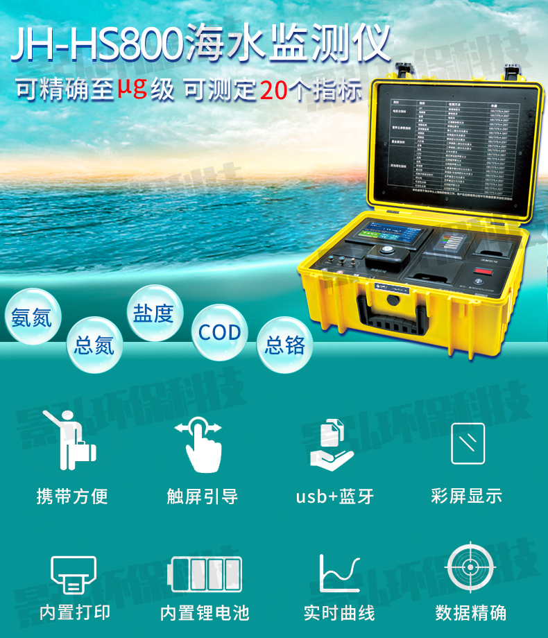 JH-HS800 型海水環境現場監測儀(旗艦版):【PH、濁度、溶解氧、鹽度、COD、氨氮、硝酸鹽氮、亞硝酸鹽氮、硅酸鹽、磷酸鹽、總磷、總氮、揮發酚、氰化物、陰離子表面活性劑、六價鉻、總鉻、硫化物、可溶性總磷、可溶性總氮】