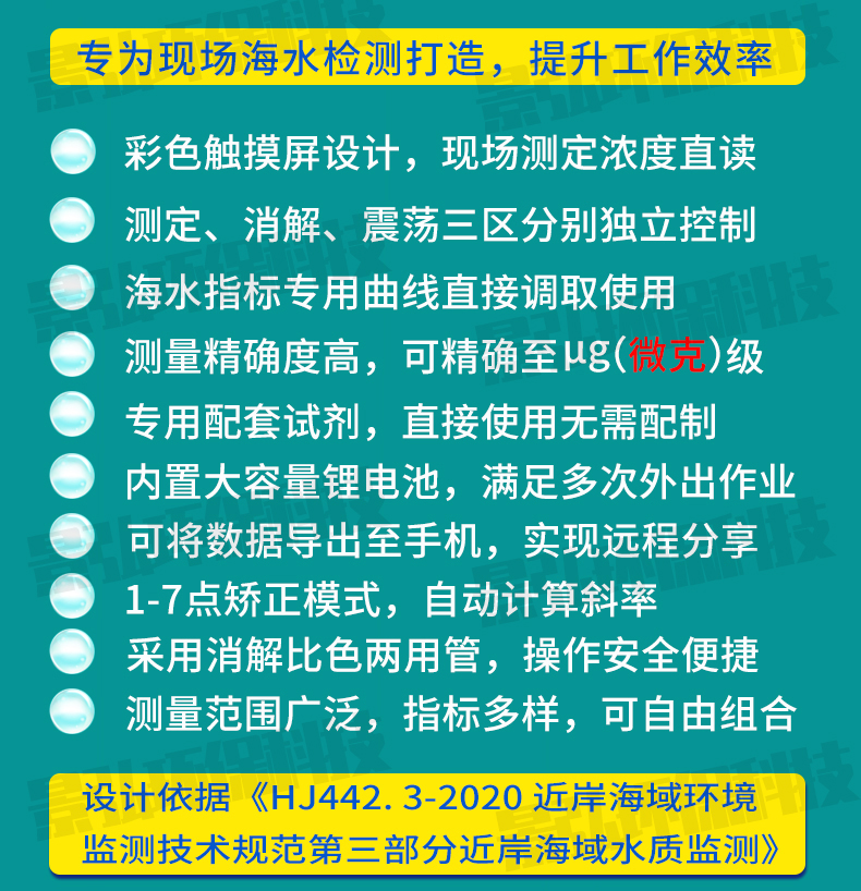 隨著科學技術的進步,在光學、電學、機械學、材料學飛速進步的帶動下,海洋環境監測技術不斷更新完善,監測儀器性能已有大幅提高,但專門用于海水水質進行現場監測的便攜式儀器并不多見。海水的測定具有被測物含量低、干擾大、鹽度高、現場測定環境惡劣等特點,普通的水質測定儀很難達到海水指標檢測的要求,而精密的測定儀器成本高,測定程序復雜,測定周期長,很難實現現場的海水測定,針對這一情況,我司技術研發人員參照HJ442-2020《近岸海域環境監測技術規范》、GB 17378.4-2007《海洋監測規范 第4部分:海水分析》、以及GB3097-1997《海水水質標準》等標準中的相關要求和檢測方法,深入研究,推出可用于實驗室、戶外、監測船上的JH-HS800型海水環境現場監測儀,解決了上述測定難點。該儀器測定方法嚴格依據技術規范,將測定設計的盡量方便、快速、準確,大部分指標可達到微克*含量的測定,幾十種指標的測定只需要一臺儀器就能實現,解決了海水現場檢測的難題。